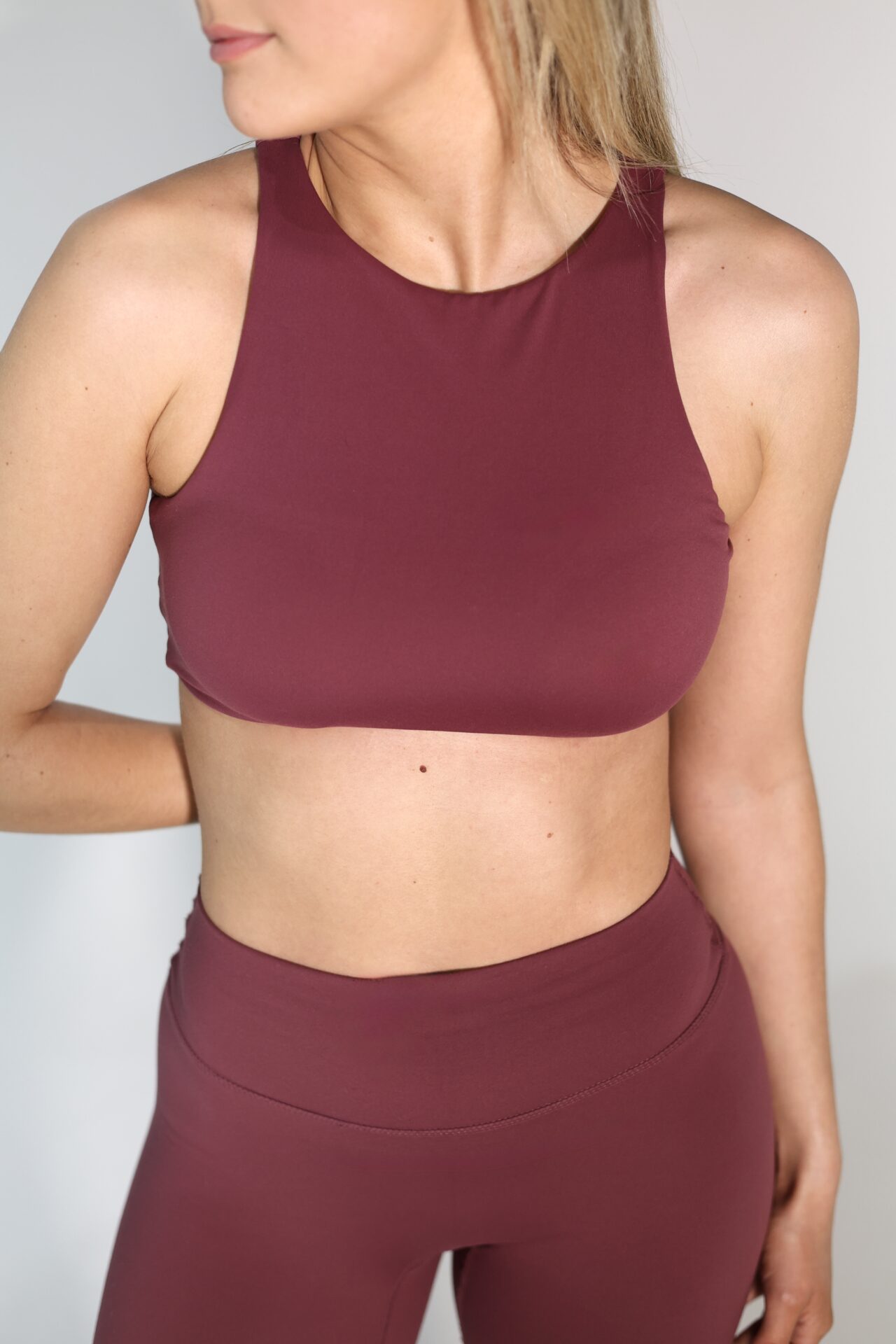 An essential addition to your active wardrobe. Buttery smooth brushed fabric in a flattering racer neckline with a cut out scooping back. With removable padding to adjust your support, in a warm mulberry hue . Perfect for doing everything, all seasons.